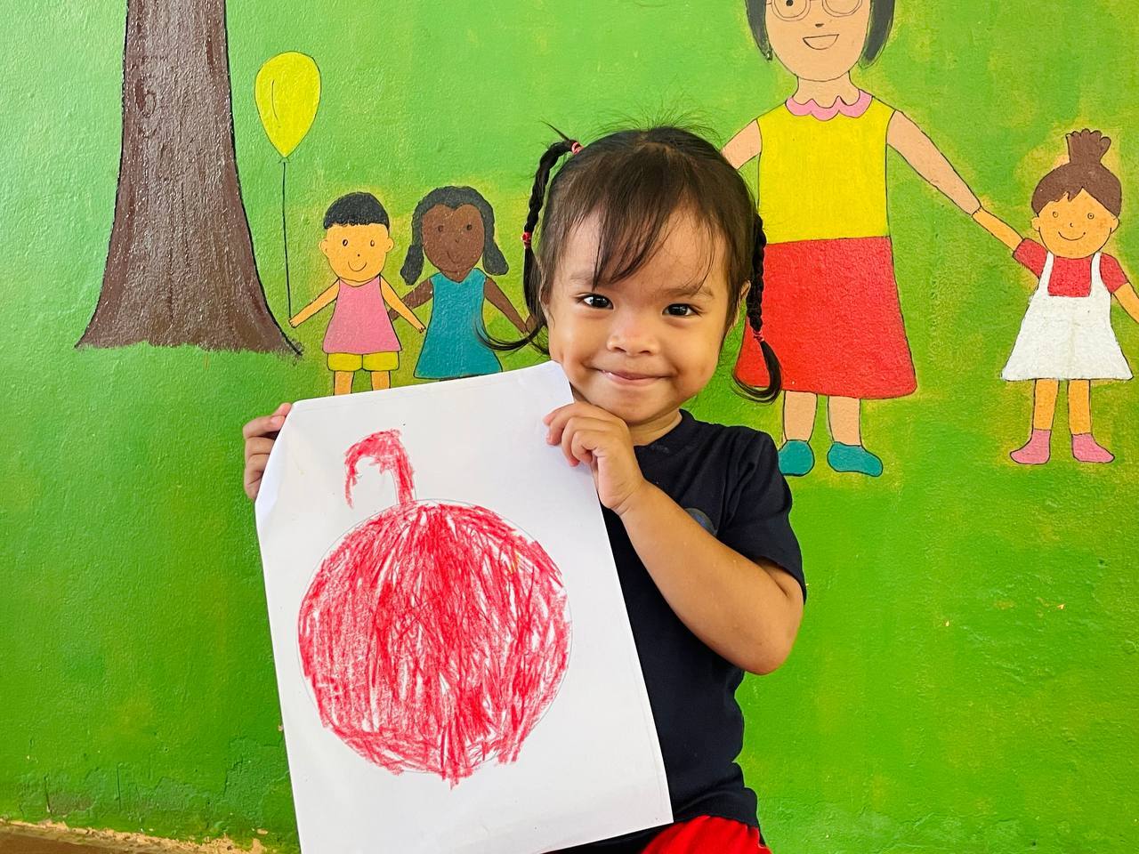 Sarai, age 3, proudly shares her artwork at LWB’s Early Childhood Development Center, where play-based lessons help children build confidence and curiosity.
